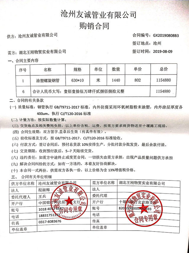 2019年8月9日我公司與湖北王剛物貿(mào)實(shí)業(yè)有限公司簽署購(gòu)銷合同,市政管廊工程用DN600涂塑復(fù)合鋼管1440米,我公司專業(yè)于涂塑復(fù)合鋼管領(lǐng)域,目前國(guó)內(nèi)多地區(qū)的管廊工程建設(shè),給排水管道多用于涂塑復(fù)合鋼管,今后我們多重視于產(chǎn)品質(zhì)量,提高服務(wù)。